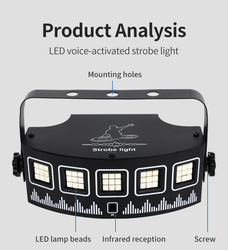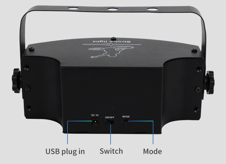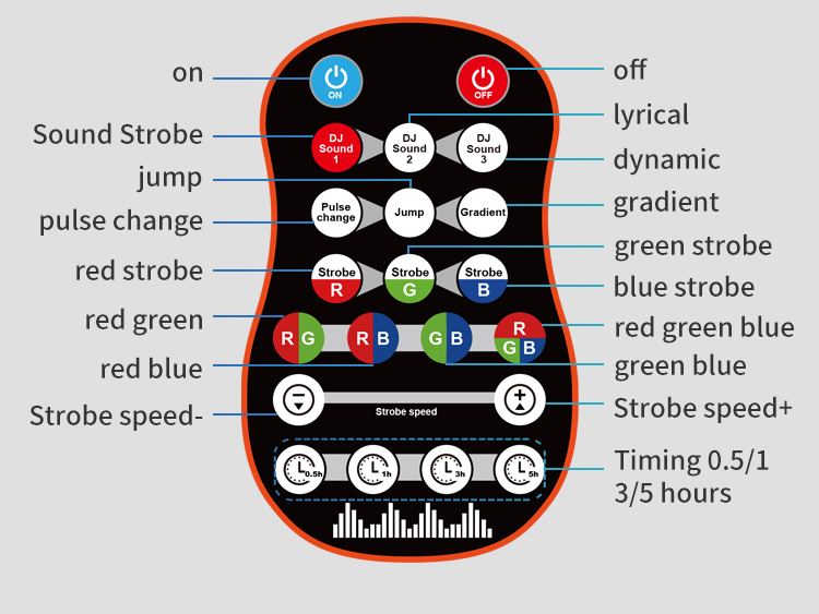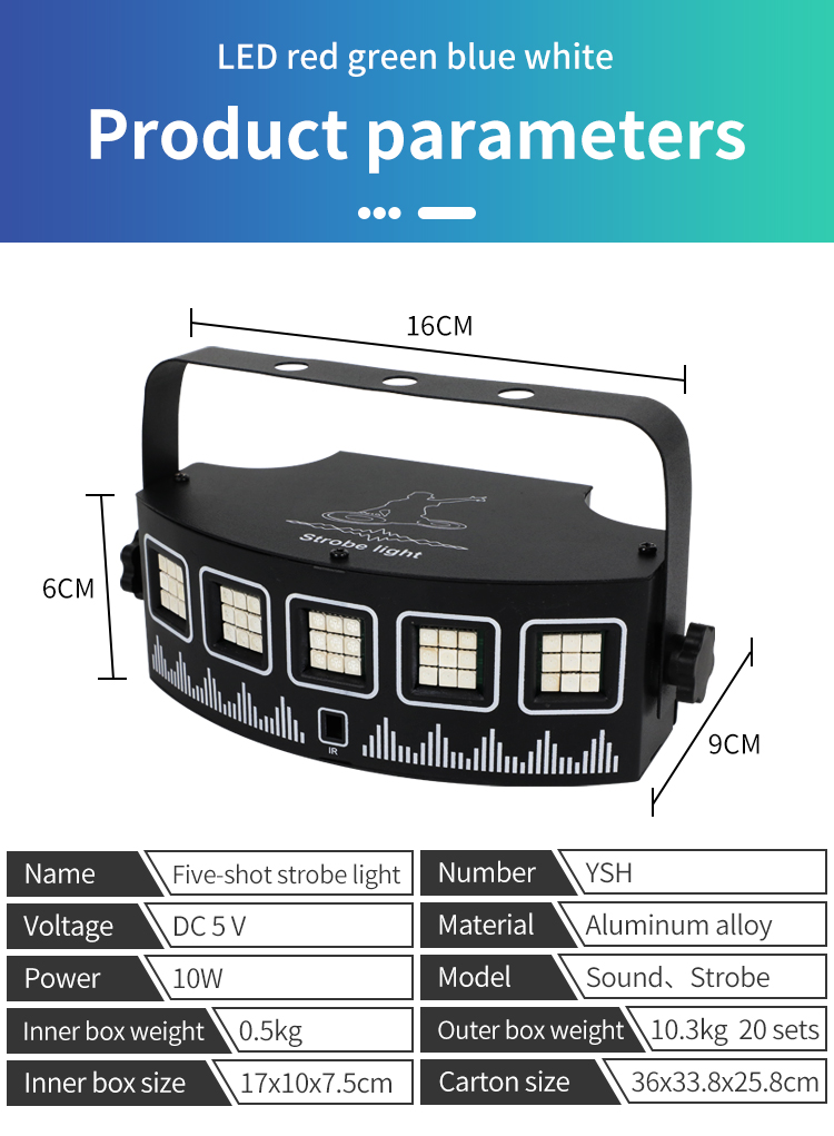 Adjustable single red/green/blue/red-green/red-blue/blue-green/red-blue-green and other various colors, adjustable stroboscopic speed and timing function