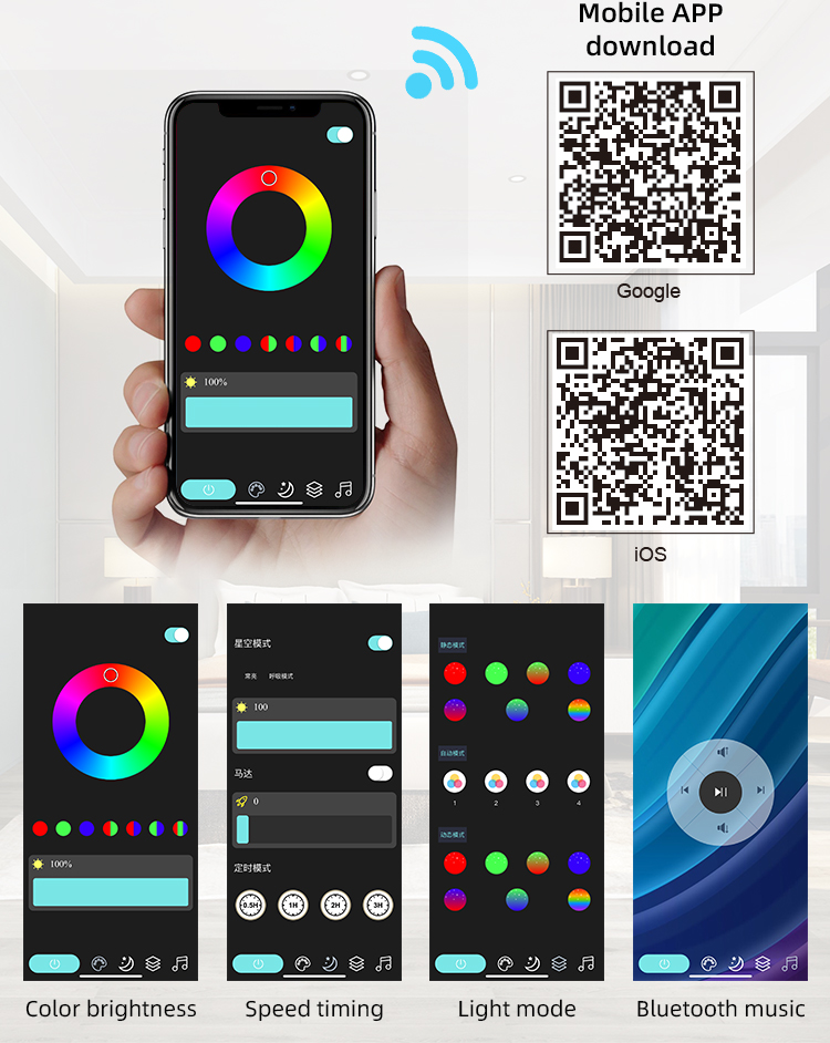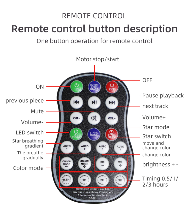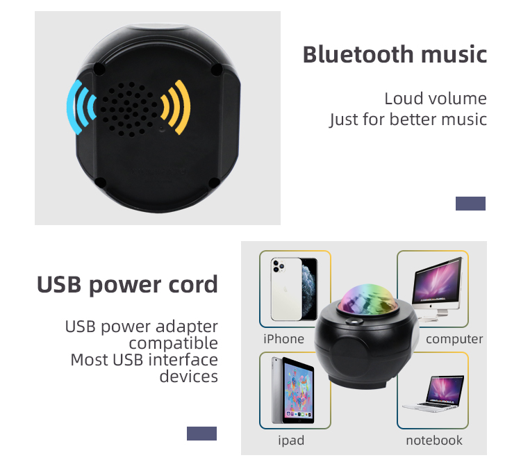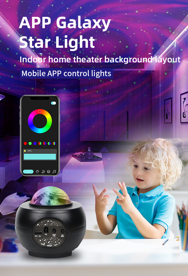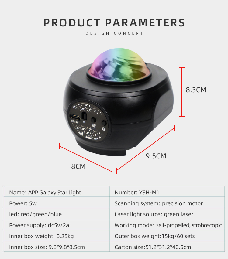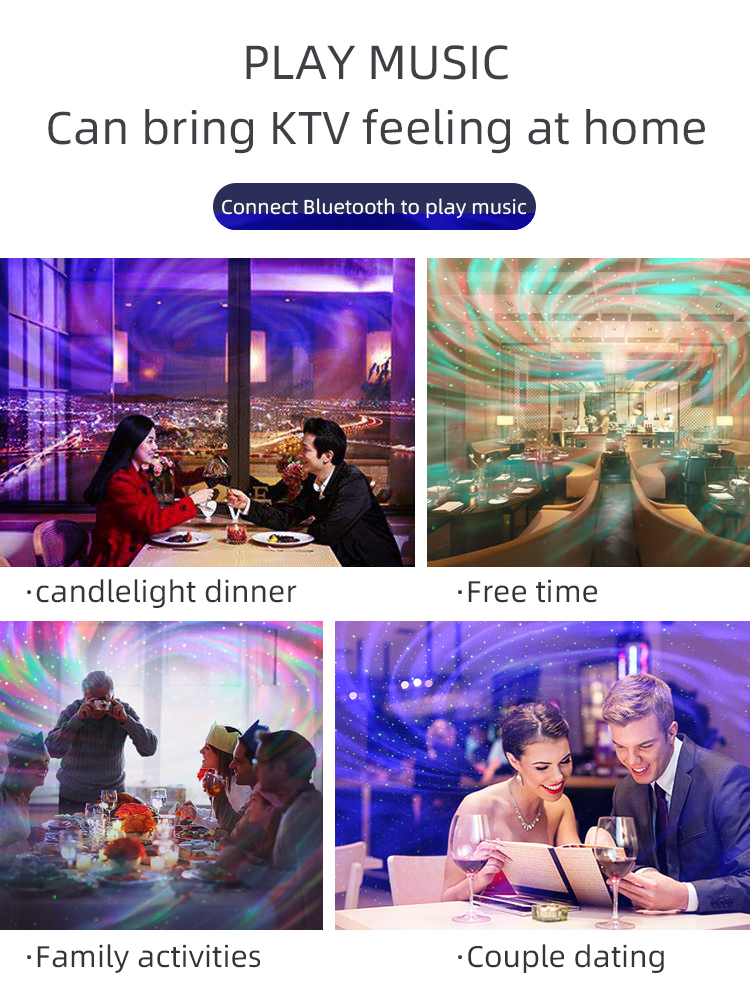 Packaging list: Bluetooth Music Starry Projector x1 +USB cable x1 + remote control x1 + instruction manual x1